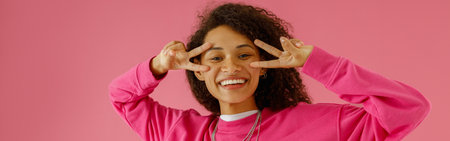 Photo Of A Calm African American Male Model With A Brown Hair Isolated On A Flat Blurred Deeppink Background With Copy Space, Banner Template. Generative AI