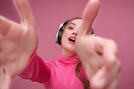 Close-up portrait of smiling young redhead woman making selfie using two hands. Funny smiling girl wearing headphones giving a gift isolated on pink background. Copy space.