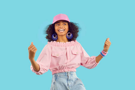 Childrens positive emotions. Happy ethnic preteen girl rejoices in her success and victory clenching her fists with joy on light blue background. African-American child rejoices in achieving goal.