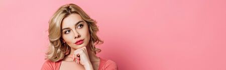 panoramic shot of pensive girl looking away while holding hand near chin on pink background
