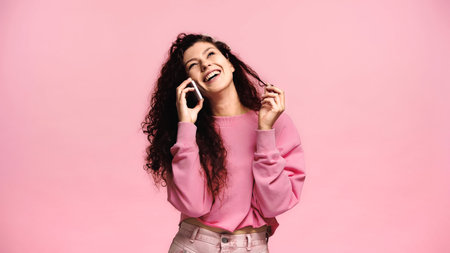 happy woman talking on smartphone and laughing isolated on pink