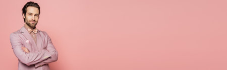 Confident host of event looking at camera isolated on pink, banner