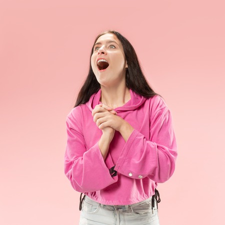 Wow. Beautiful female half-length front portrait isolated on pink studio backgroud. Young emotional surprised woman standing with open mouth. Human emotions, facial expression concept. Trendy colors