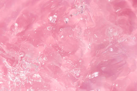 Background from cosmetic gel with bubbles,dripping down.Bright pink color,copy space for text or design.Top view,antibacterial liquid surface.Good as background or mockup.