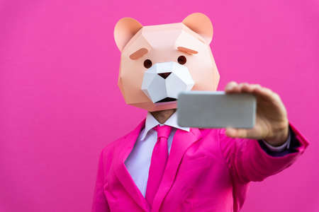 Happy man with funny low poly mask on colored background - Creative conceptual idea for advertising, adult with low-poly origami paper mask doing funny poses