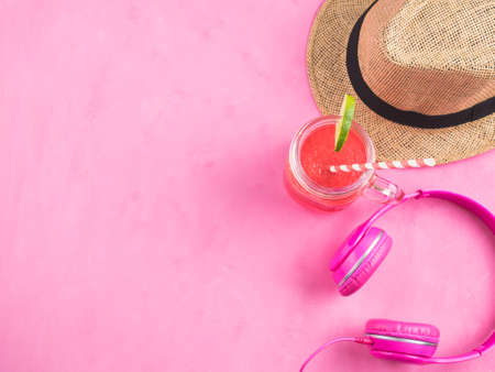 Straw hat, fresh watermelon smoothie and headphones on pink background. Summer flat lay