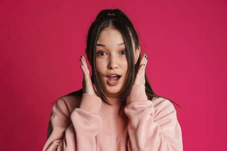 Closeup portrait of shocked cute Asian student young lady in pink hoodie sweatshirt with cute headphones posing isolated on over pink studio background. Good offer. Sound streaming platform ad concept