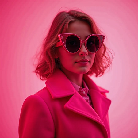 This image features a stylish woman in a striking pink suit, exuding confidence while standing against a vibrant pink wall. A blend of modern elegance and bold style.