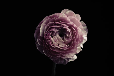 Beautiful fresh ranunculus on black background. Floral card design with dark vintage effect