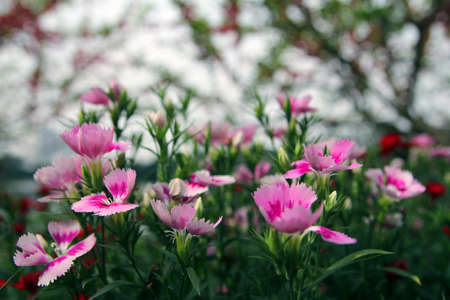 Pink small garden flowers in park. Garden flowers blooming in summer