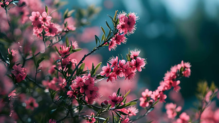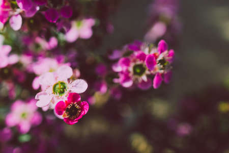 close-up of pink tea tree plant with flowers outdoor in sunny backyard shot at shallow depth of field