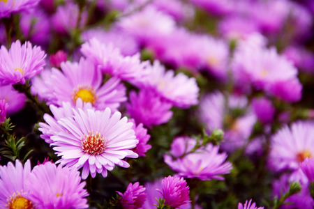 Small garden Astra flowers. Group of Alpine asters (Aster Alpinus)
