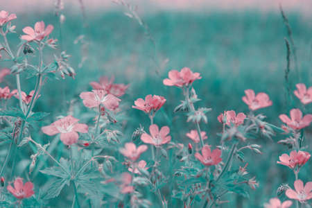 Bright delicate pink wildflowers on a light background. Postcard with space for design.