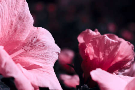 Beautiful pink hibiscus flower on nature on soft light - dark background, macro. Elegant amazing art image.