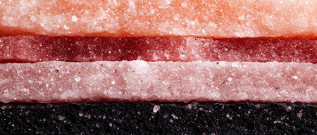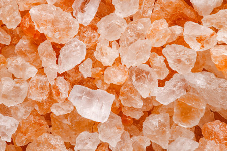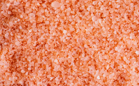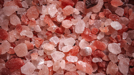 Detailed macro background of pink Himalayan salt crystals with natural mineral tones, ideal for food, wellness, spa and seasoning concepts.