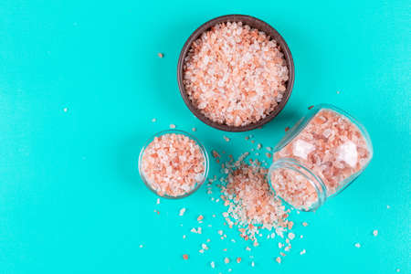 Some himalayan salt in a bowls and small jar on cyan blue background, flat lay.