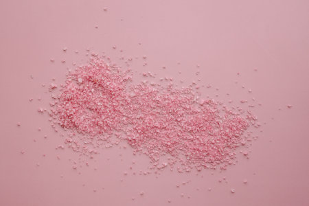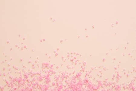 Spa therapy. Pink bath salt crystals scattered over peach surface. Abstract background. Copy space.