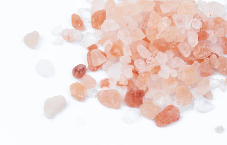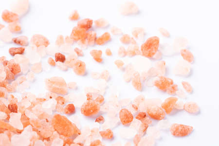 Small heap of pink rock salt on white background with copy space. unaltered, ingredient, food, rock salt, white and seasoning.