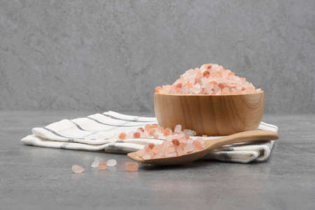 Pink himalayan salt in a wooden bowl on a light gray background, close up