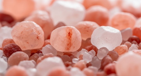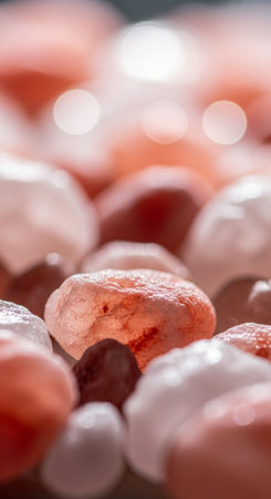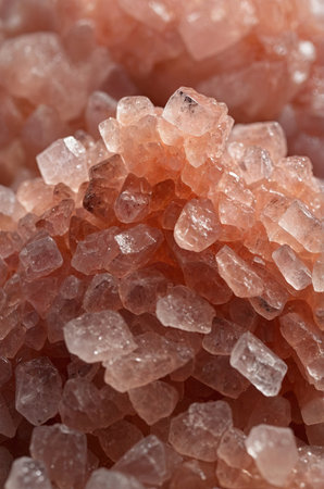 Macro shot of rough pink Himalayan salt crystals in textured pile. Warm rose hues and natural light accent granular details, ideal for cooking, spa, health food, seasoning, mineral texture concepts