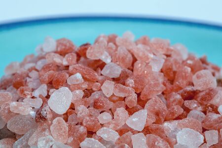 Close-up of Himalayan pink salt crystals. Selective focus. Space for text