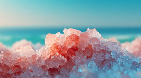 Pink salt crystal pile with ocean background under bright sunlight creating vibrant and refreshing atmosphere