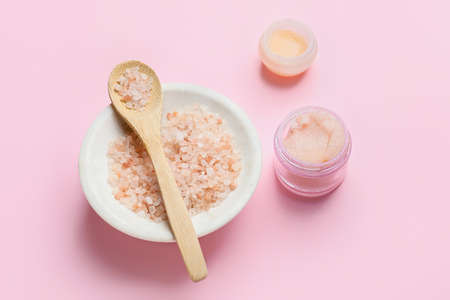 aromatic pink Himalayan sea salt on pink background. Homemade Herbal bath salts. Skincare spa beauty bath cosmetic products for relax. Natural skin care. Top view, copy space. Home spa. Aromatherapy