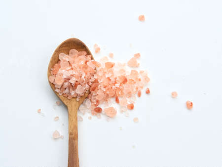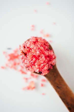 A spoon of pink himalayan salt on white table, copy space. Close up.