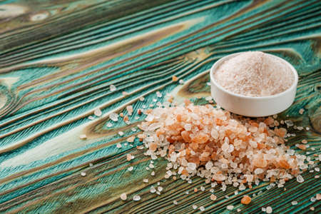 himalayan pink salt composition flat lay with free space for copy pink wood background