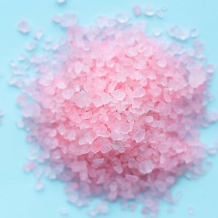 heap of large sprinkled crystals of pink sea salt closeup on a blue background with place for text. body care concept.