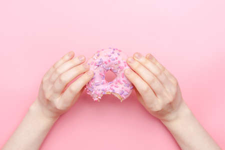 girl holding a glazed pink donut on a pink monochromatic background