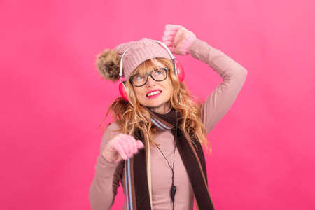 adult or senior woman dancing with headphones and winter clothes