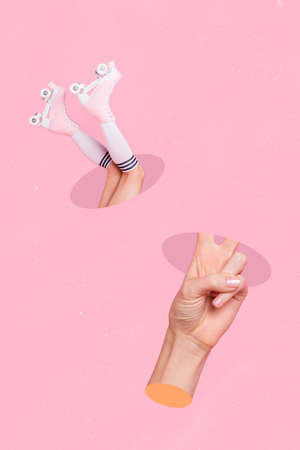 Vertical collage image of big arm demonstrate v-sign girl legs wear rollerblades through hole isolated on pink creative background