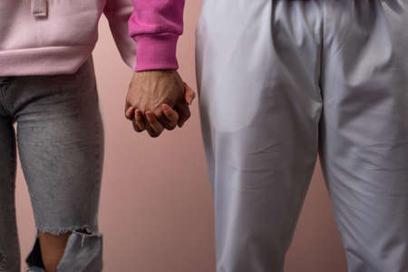 Close-up of young biracial couple holding hands over pink background.