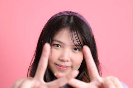 Image closeup of two teenage girls playing together and making figures with hands isolated over pink background