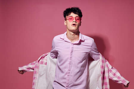 handsome guy pink shirt and glasses jacket fashion elegant style pink background unaltered