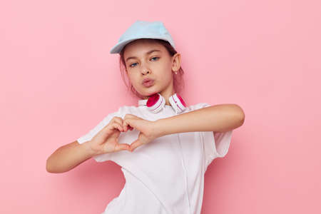 Portrait of happy smiling child girl wearing headphones posing emotions isolated background