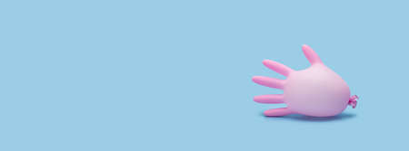 Pink medical inflated glove on a blue background. Banner. Prevention of coronavirus, covid-19. Healthcare concept. Copy space.