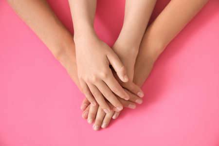 Female hands with pink nail design. Pink nail polish manicure. Female hands on pink background
