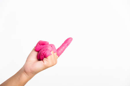 Woman hand wearing pink finger cots rubber protect help prevent fingerprints on the finger touched piece with poinging finger, studio shot isolated on white background
