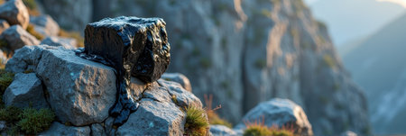 Black cube sculptures on rocky mountain landscape with natural light. That the image is generated using AI.