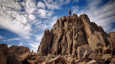 a man climbing mountain. Rock mountain background. worm eye view. Generative AI