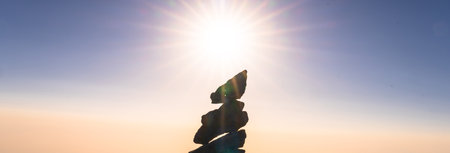 The stones are stacked evenly on top of each other, the sunlight falls on them, a mountain scene