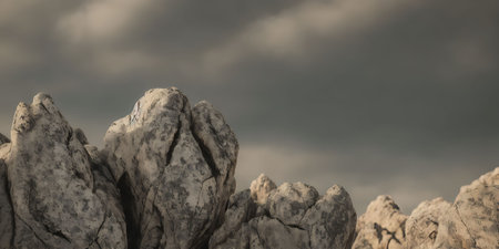 Rocky landscape with cloudy sky. 3d rendering. Computer digital drawing.