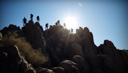 Men and women hiking up mountain peak, enjoying nature beauty generated by artificial intelligence