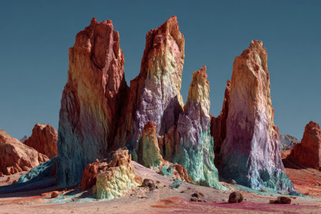 Unique rock formations rise dramatically in a desert landscape, showing vibrant hues of red, orange, yellow, green, and blue, all under a pristine blue sky.