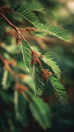 Clusters of pine cones emerge from verdant branches in a tranquil natural setting during a bright afternoon showcasing natures beauty.