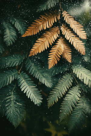 Green and Golden Tropical Ferns After Rain. Moody Nature Ferns Abstract Background, Close Up.