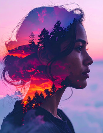 Natural Double exposure, Woman, empowerment, healing, self-improvement, compassion, understanding