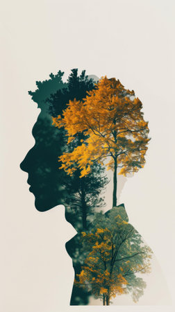 A stunning double exposure image featuring a persons head with lush trees artistically emerging from it, creating a unique visual effect